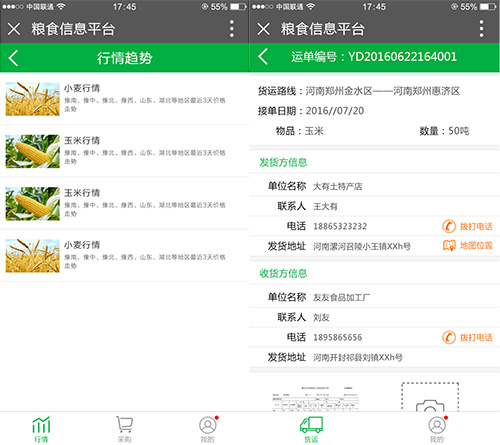 该项目包括了服务端(整个平台管理、数据存储、订单状态处理)、业务员端(业务处理粮食信息采购、物流信息发布、车辆选取)、供货商端(查看行情走势、发布供应信息、对平台发布的采购信息进行供货)、车主端(承接运输订单、查看运输状态、上传运输信息、结账信息查看)。